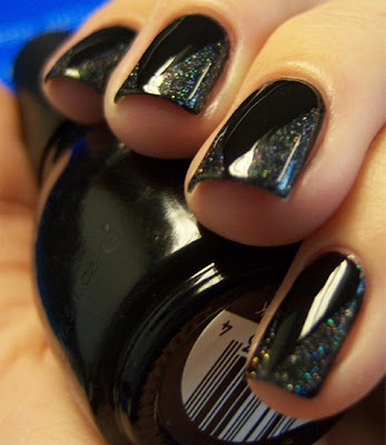Sally Hansen Night lights is a gem, that I thought I would never be lucky enough to have. I know it's been spotted here and there, in those 2-packs, but I have never seen it. Well lo and behold, I was at my local Five Below this past weekend, and they had a WHOLE display of them. I grabbed 3, 2 for me, and 1 for my future giveaway. It is rather sheer, but sooooo worth it. Here I have it over black, and I did another mani with it over a bright blue. Hopefully that will be tomorrows post. Anyways, I did a design that I know you've seen before, and I love it.